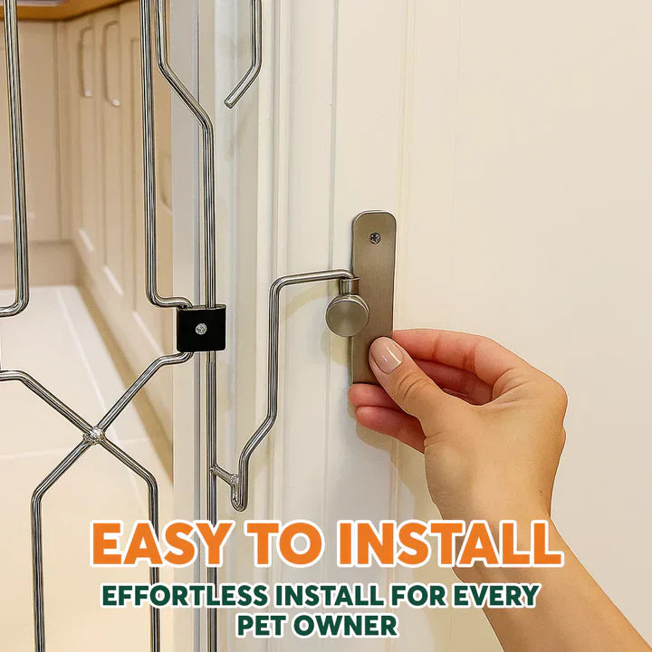 Holds back our big boy who loves to charge the front door when packages arrive. The mesh + steel frame feels solid and chew‑proof.